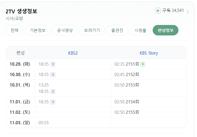 생생정보는 KBS2TV에서 평일 월요일부터 금요일까지 오후 6시 35분에 시작됩니다. 방송을 못보시거나 다시 보고 싶으시다면 다음날 KBS Story 채널을 통해 다시볼 수있습니다.